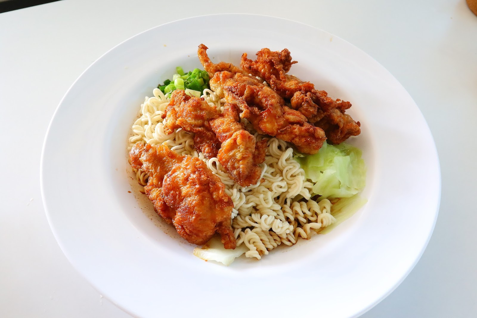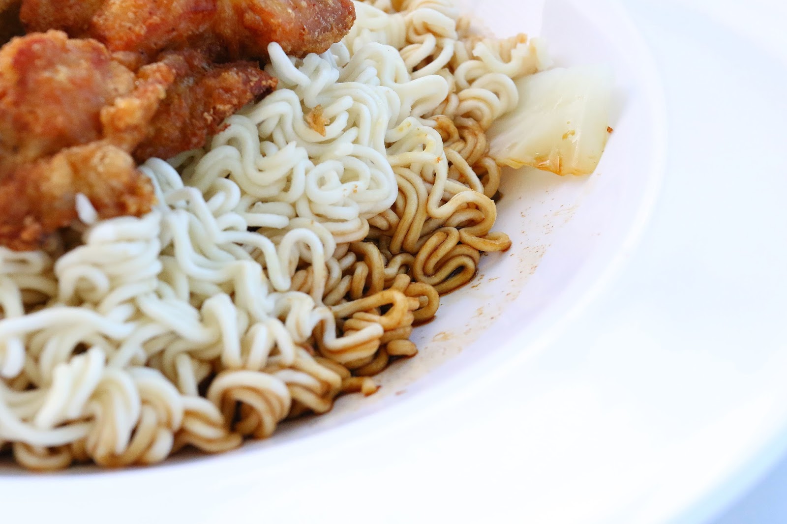使用口感比較Q一點的泡麵,配菜有炸雞腿塊、油蔥、高麗菜,