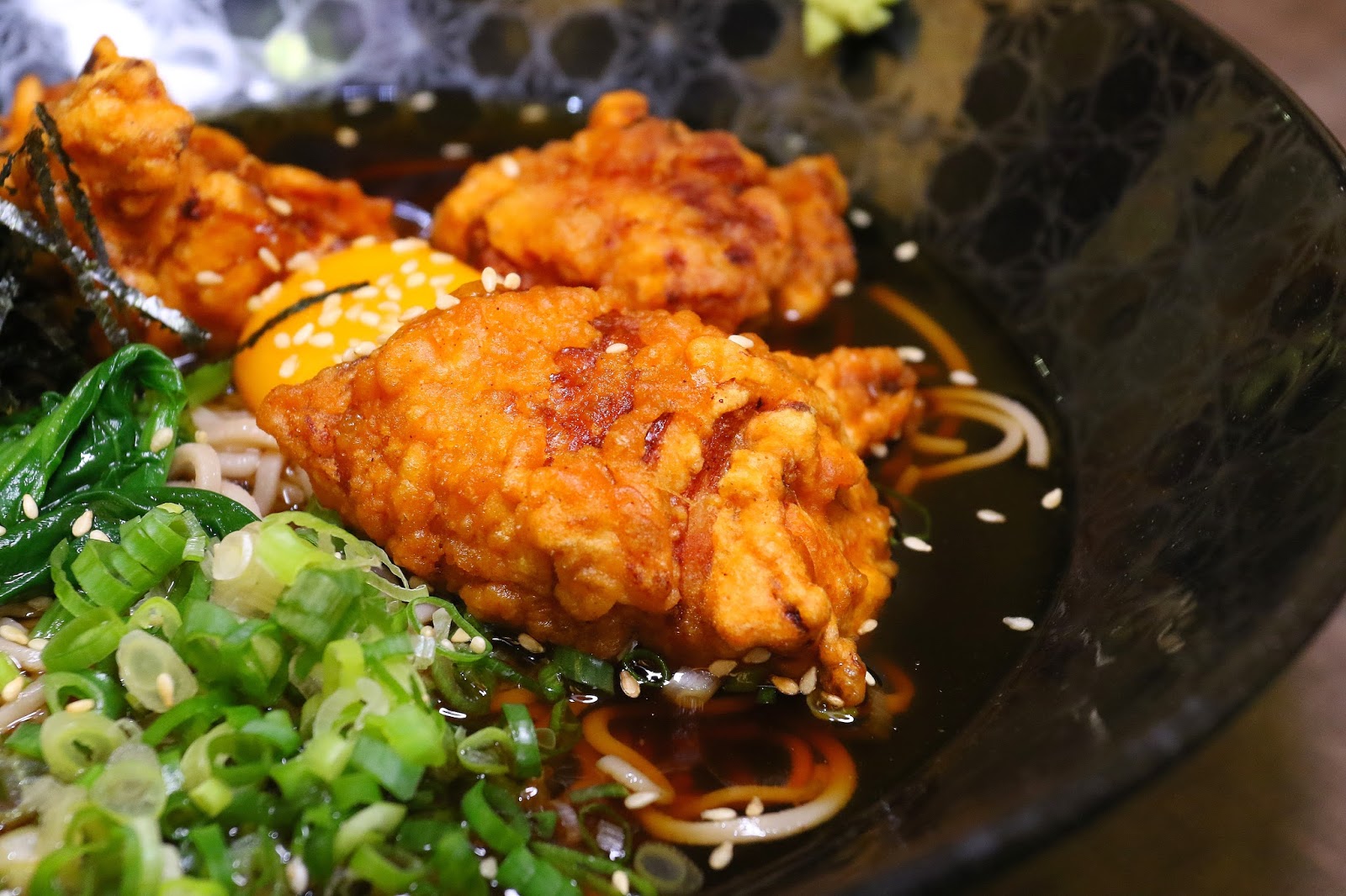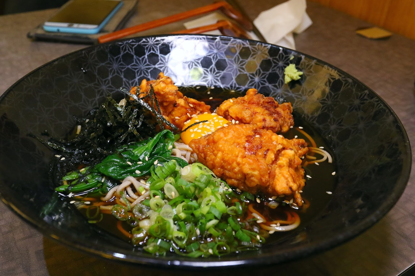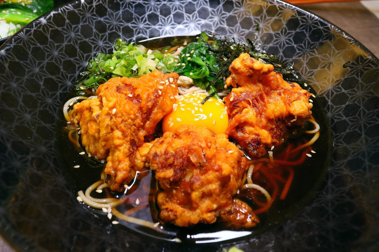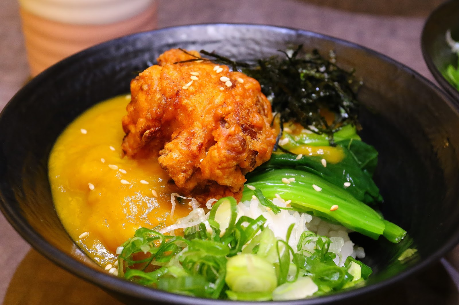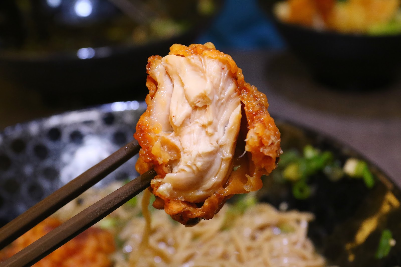 三大塊炸雞腿肉之外配菜有蔥花、冰鎮菠菜、山葵、海苔絲均勻拌開後即可食用,醬汁也是日式柴魚醬油風,
