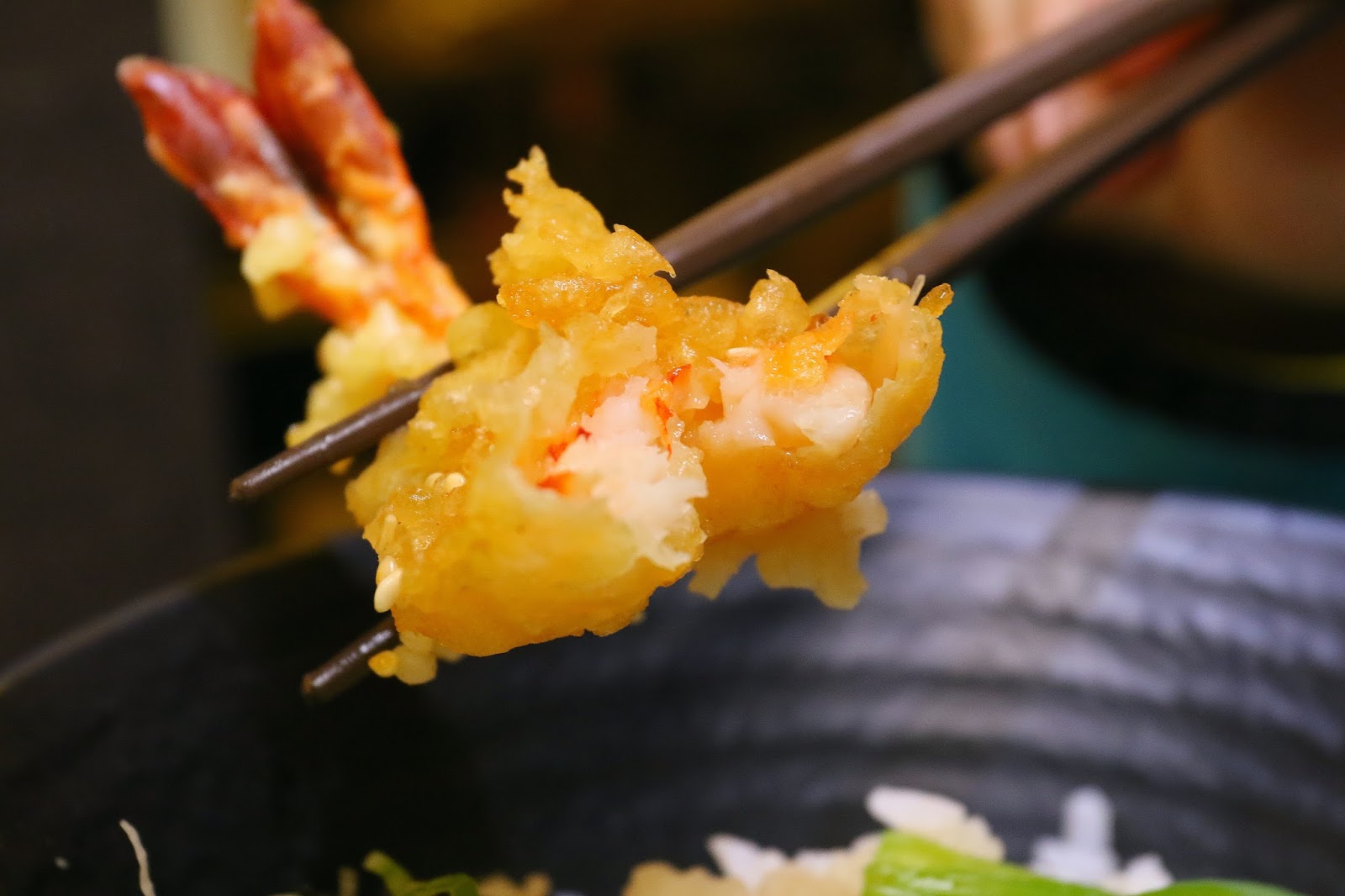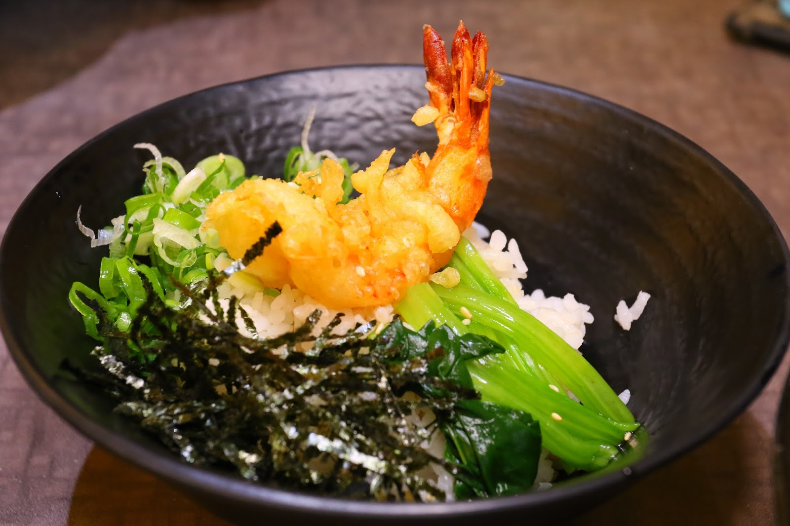 去頭斷筋後的炸蝦,配菜有蔥花、冰鎮菠菜、海苔絲,白飯上有淋上醬汁不過口味偏淡,