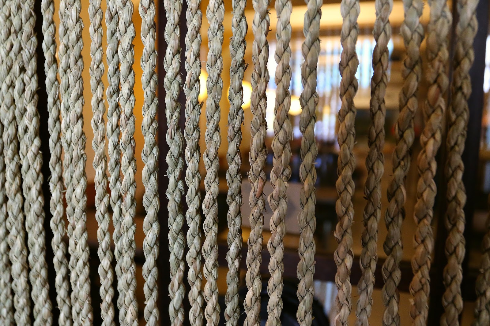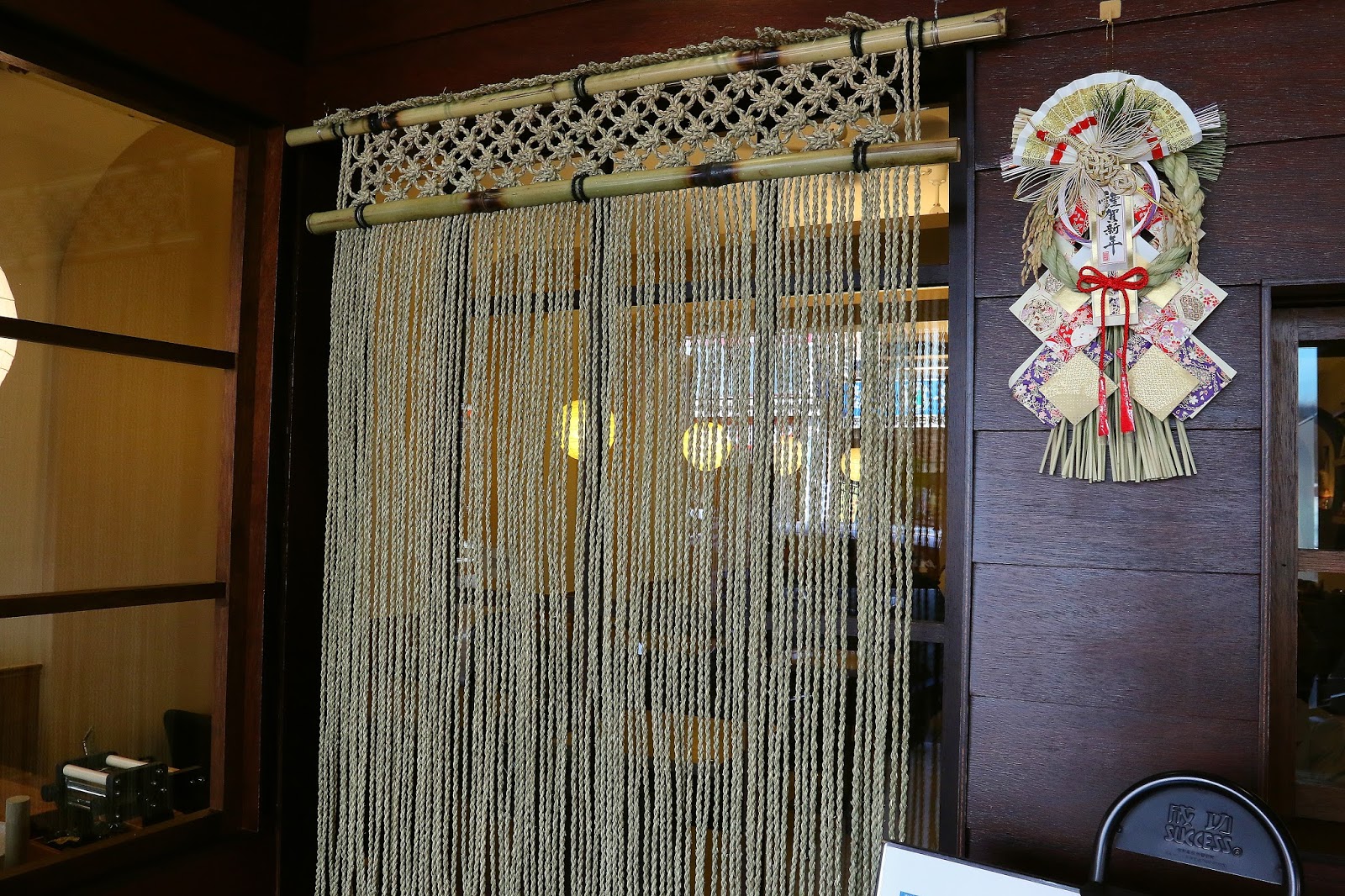 遠看以為是藺草編製的,但接近門簾入店時會聞到一股清香淡雅的稻梗味,