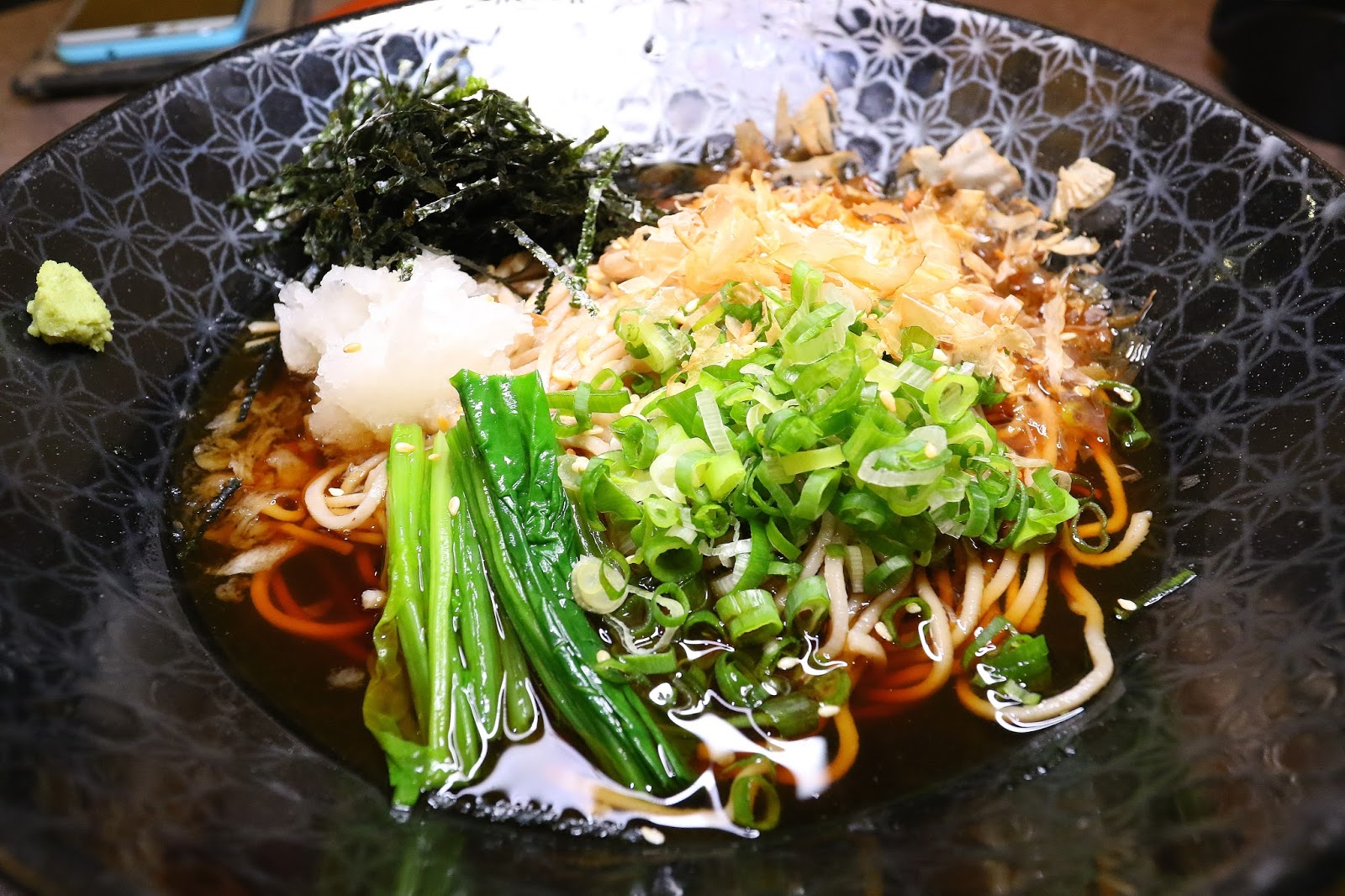 配料有蔥花、冰鎮菠菜、山葵、蘿蔔泥、海苔絲、細柴魚片均勻拌開後即可食用,