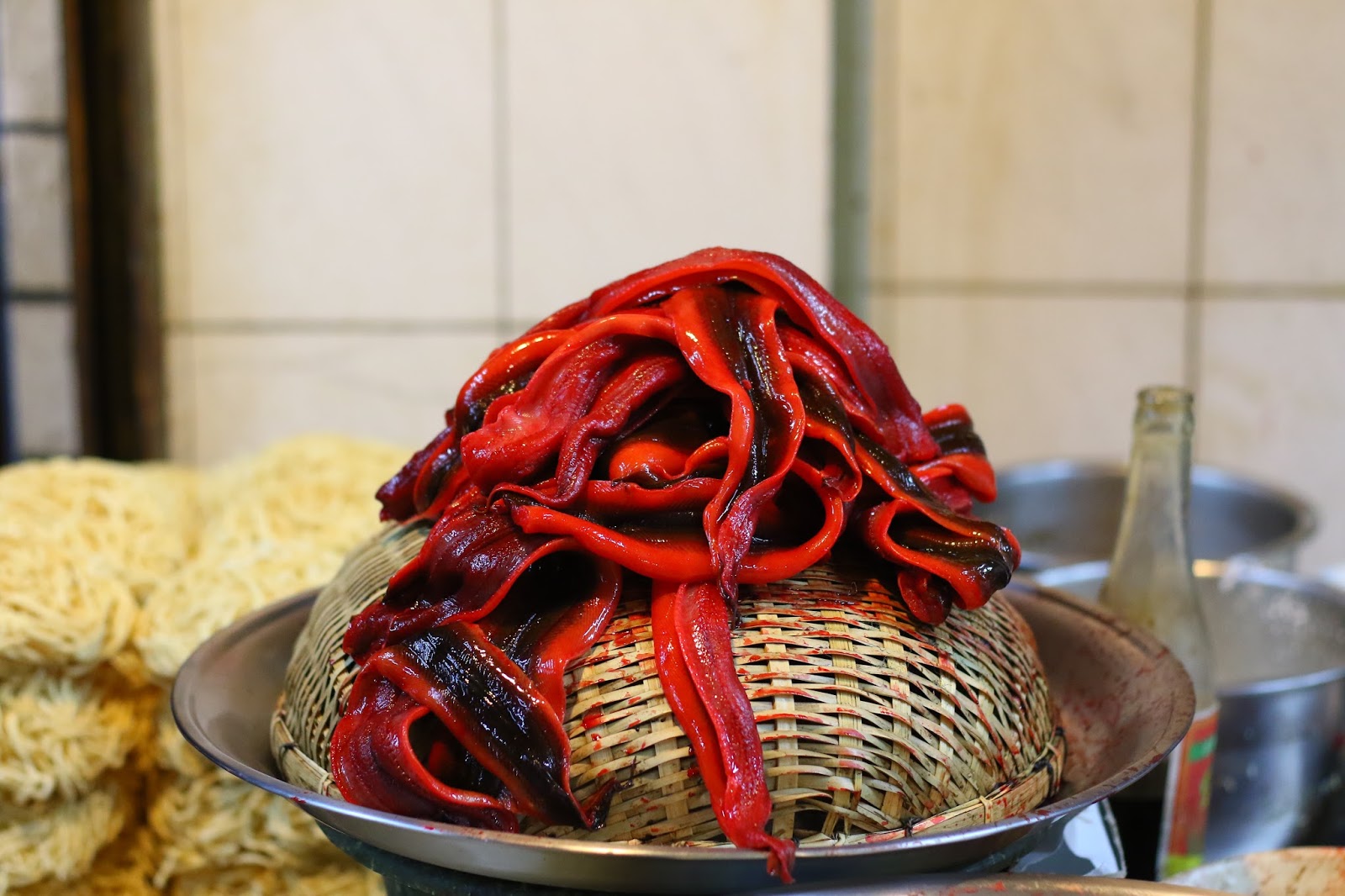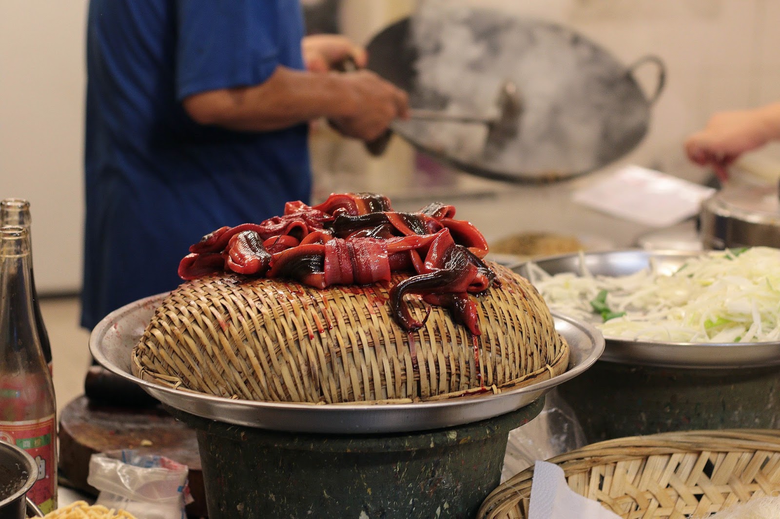 紅潤的生鱔魚現點現切就放在櫃台上,
