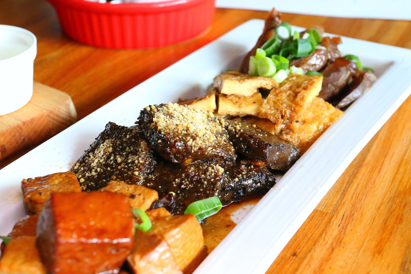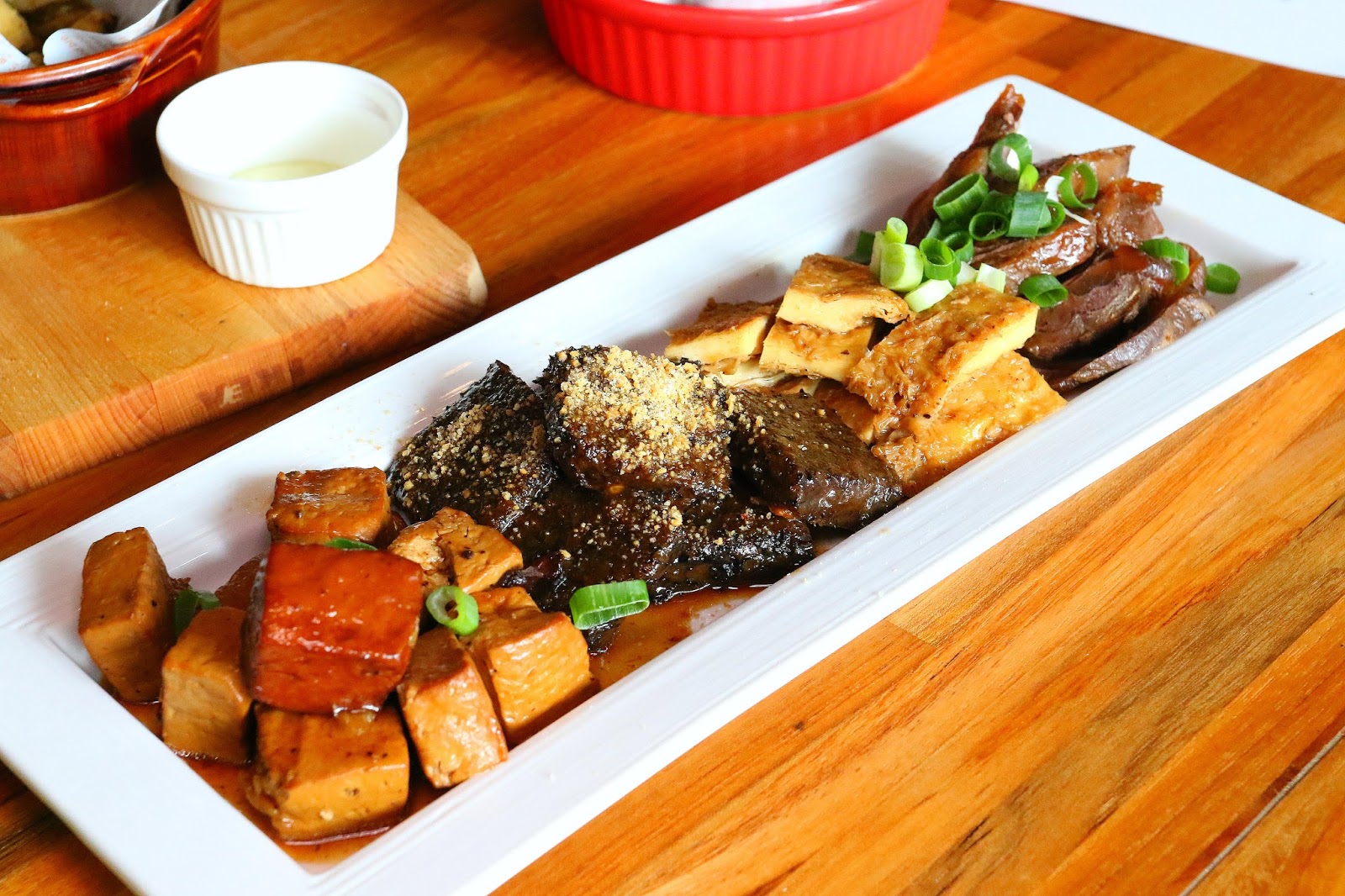 拼盤內容有豆干、滷透鬆軟的米血、豆皮、軟中帶Q的牛腱,