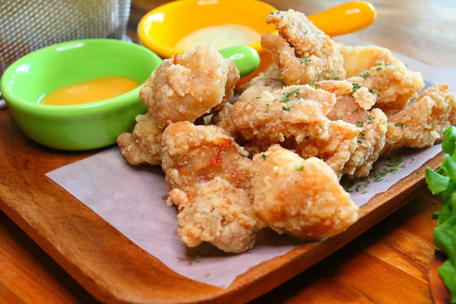 雞腿肉裹上薄粉炸至外層香酥內層有彈性不乾柴,