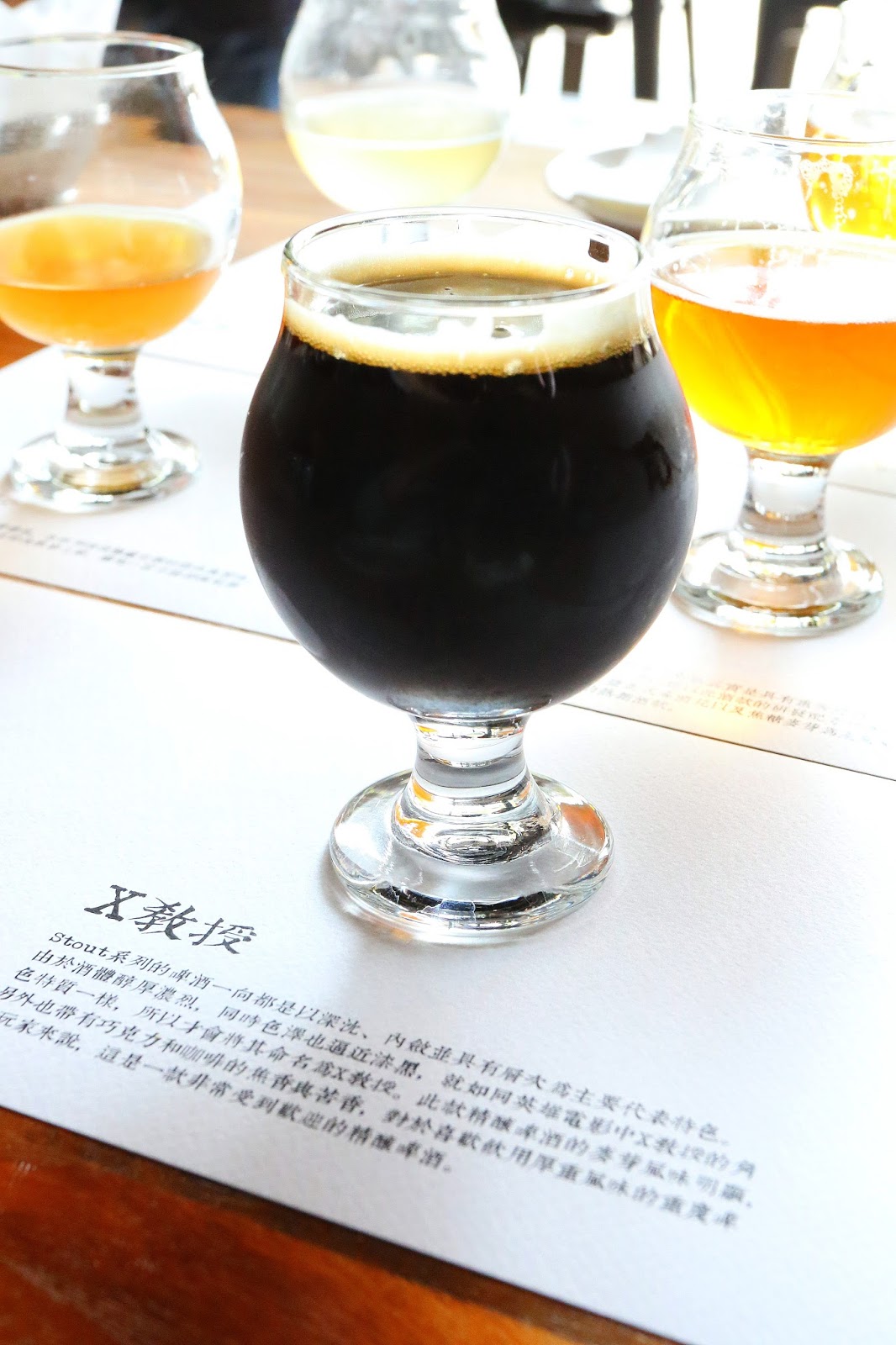 接著介紹掛板上酒名旁英文所代表的意義,以今天會品嚐到的X教授來說"Imperial Stout"是由啤酒評審認證制度BJCP(Beer Judge Certification Program),源於美國精釀啤酒品評協會制定並定義各項精釀啤酒的類型與風格,有興趣的朋友可以點這裡←下載PDF檔裡第36頁有詳細規範範圍,一旁ABV是比較常見的酒精濃度,IBU是苦度(超過50即可明顯感覺苦感),