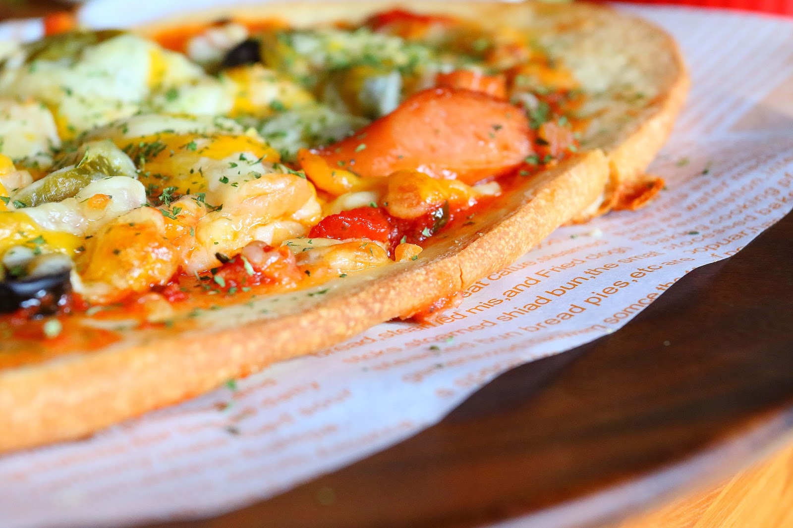 披薩上的底醬是紅醬,配料有黑橄欖、醃漬墨西哥辣椒、紫洋蔥、德國香腸、蕃茄丁,最後鋪上雙色起司,