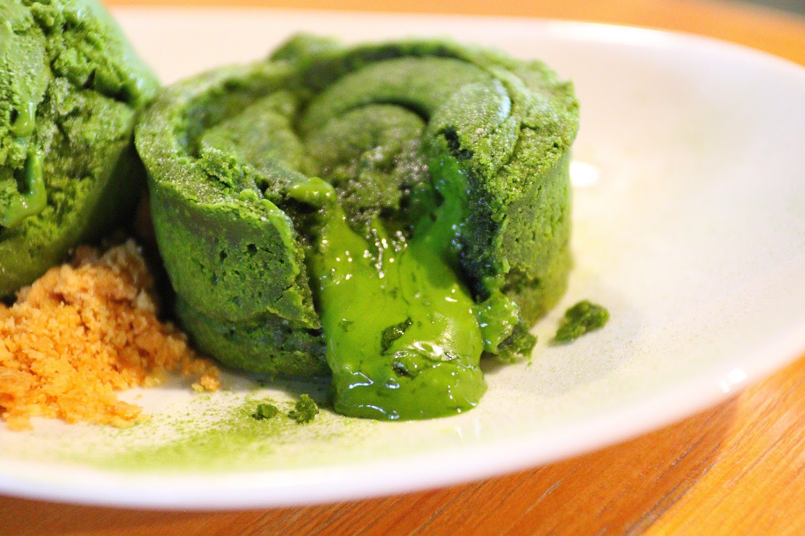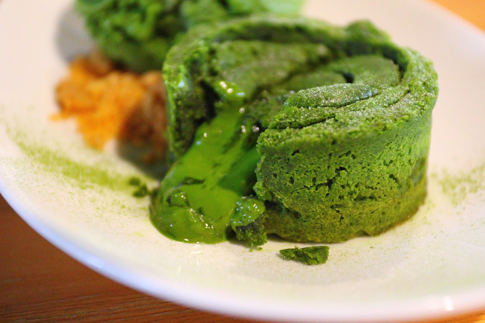 抹茶布朗尼一切開裡面融心抹茶醬就流出來了,