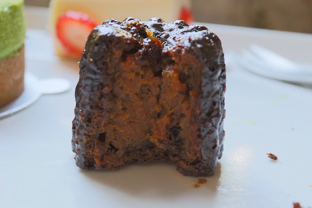 香草塔皮裡是焙茶甘納許(Ganache),巧克力裡藏著小巧思,不時能吃到糖漬柚子散發出的清新風味適時解膩,讓妳不會因為都是焙茶而膩口,