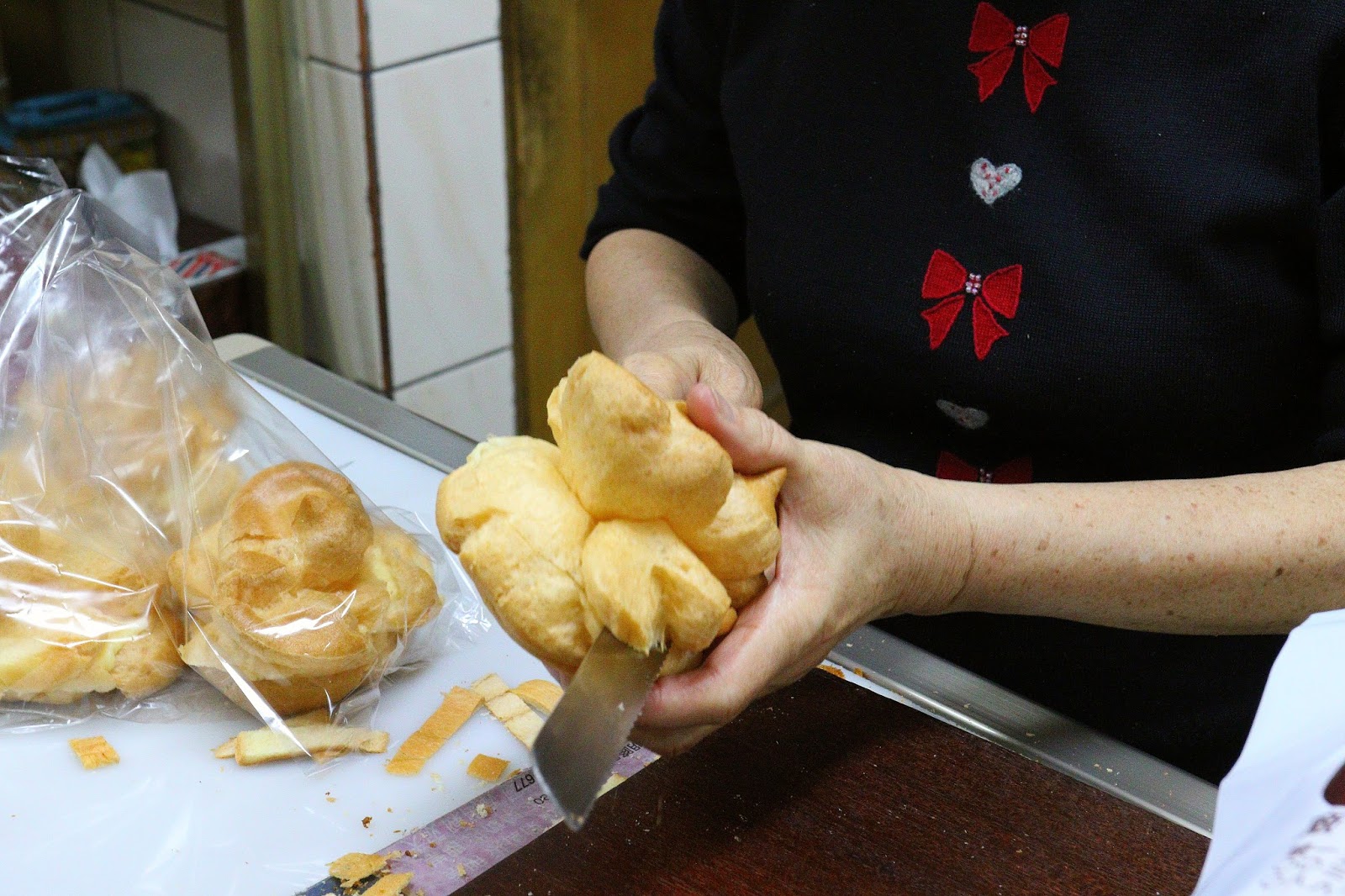 泡芙成品現點現做,老闆娘細心的切開泡芙皮,