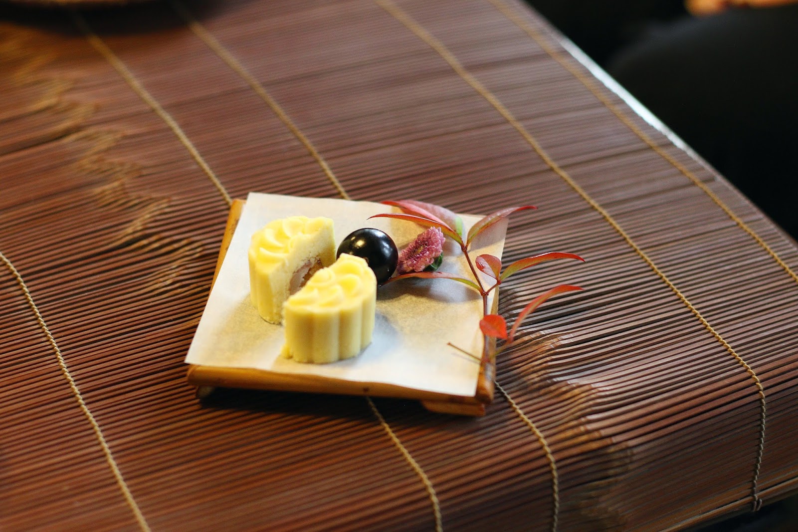 喝了幾杯後茶點也上桌了,綠豆糕內餡是蜜紅豆,再搭配上一顆香甜微酸的樹葡萄,
