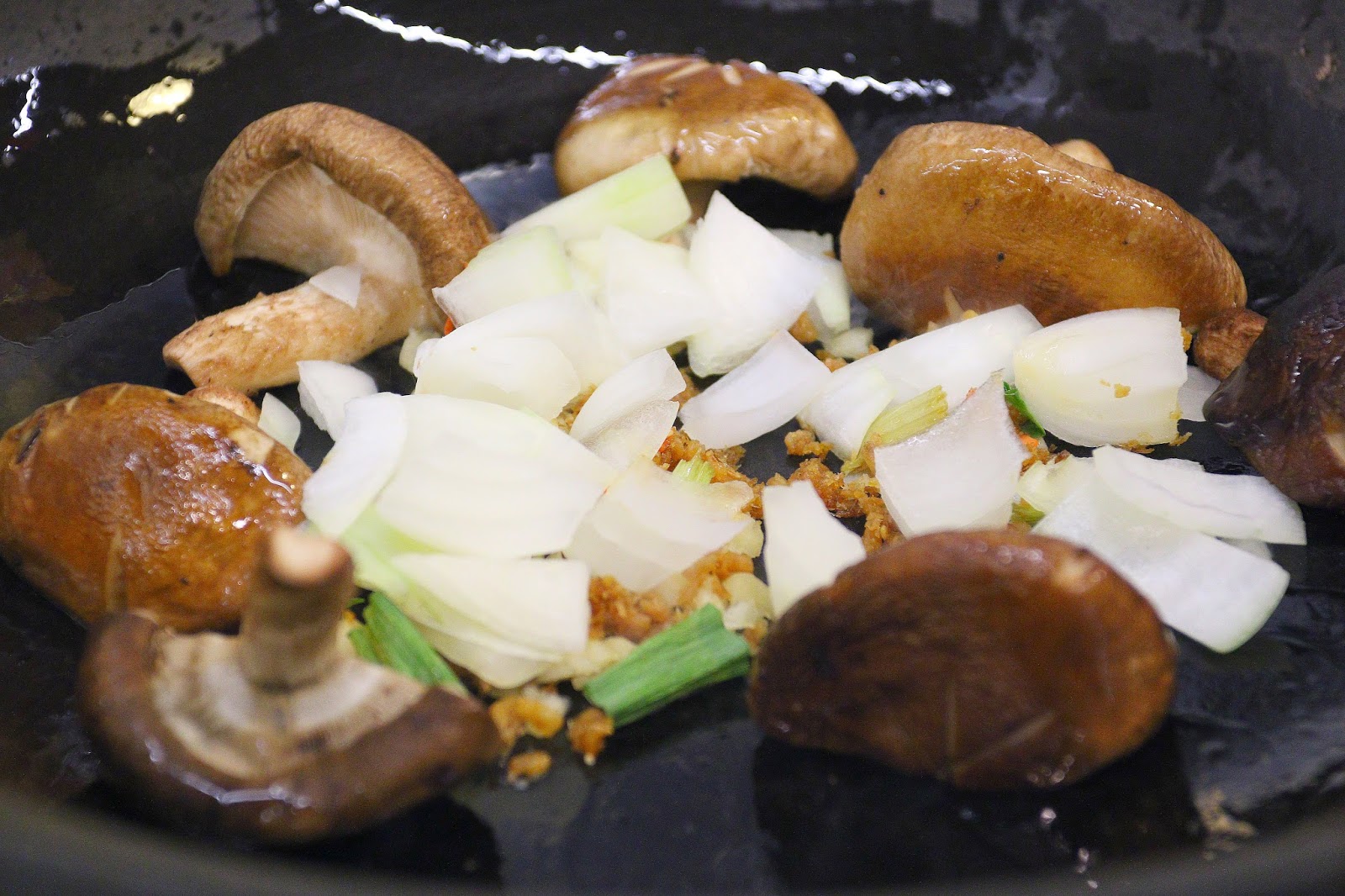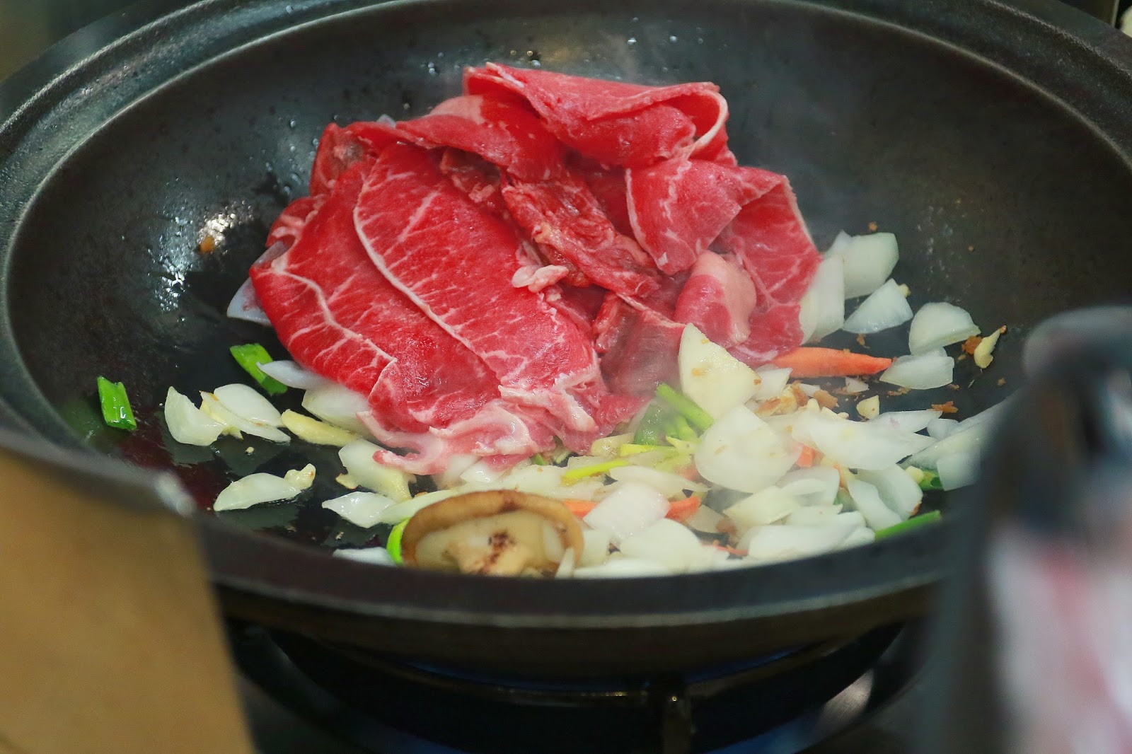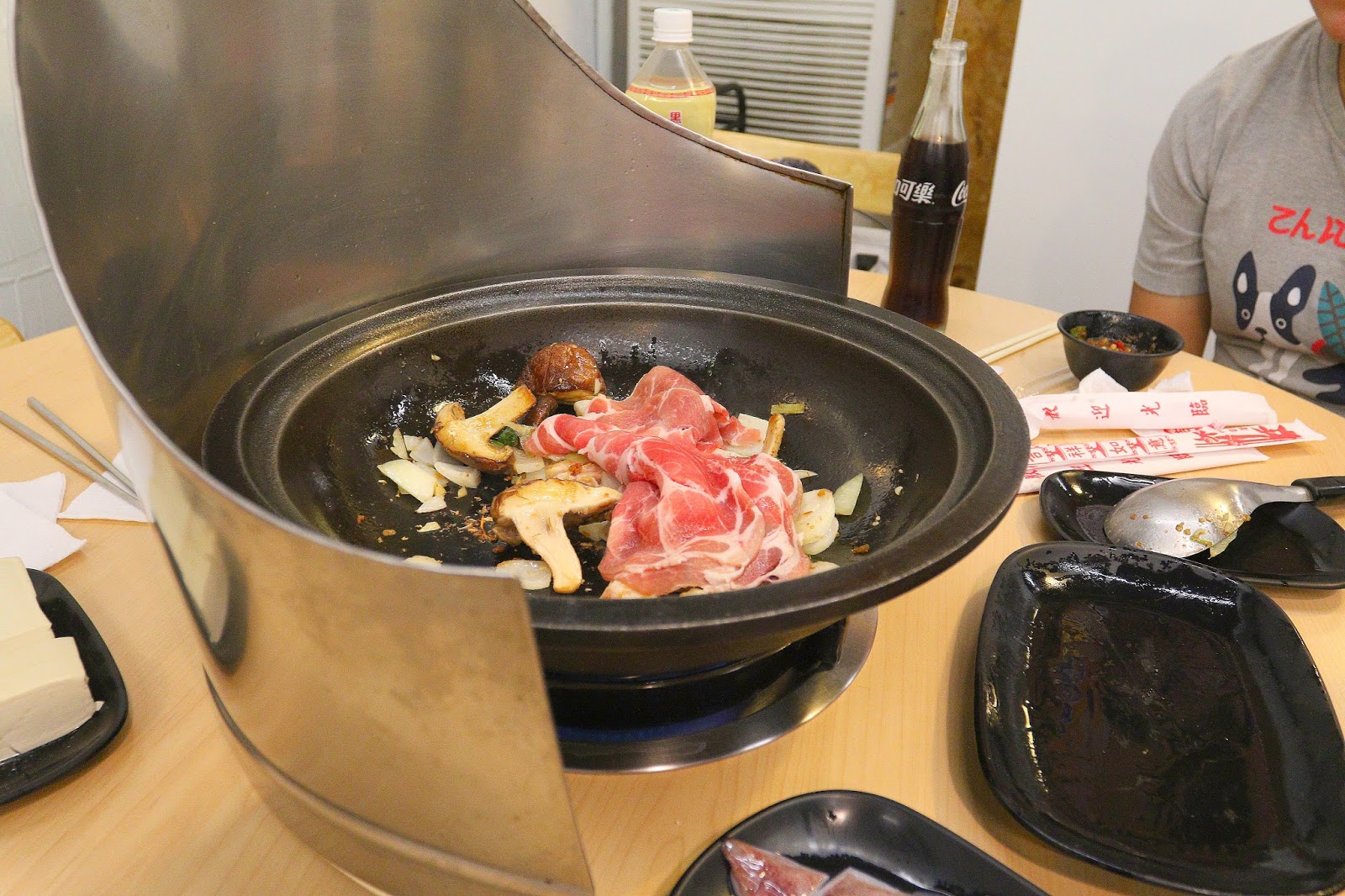 前製爆香會由服務員操作,首先放點油爆香香菇(菜盤裡只有一朵),