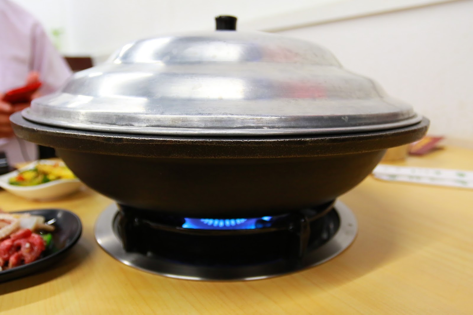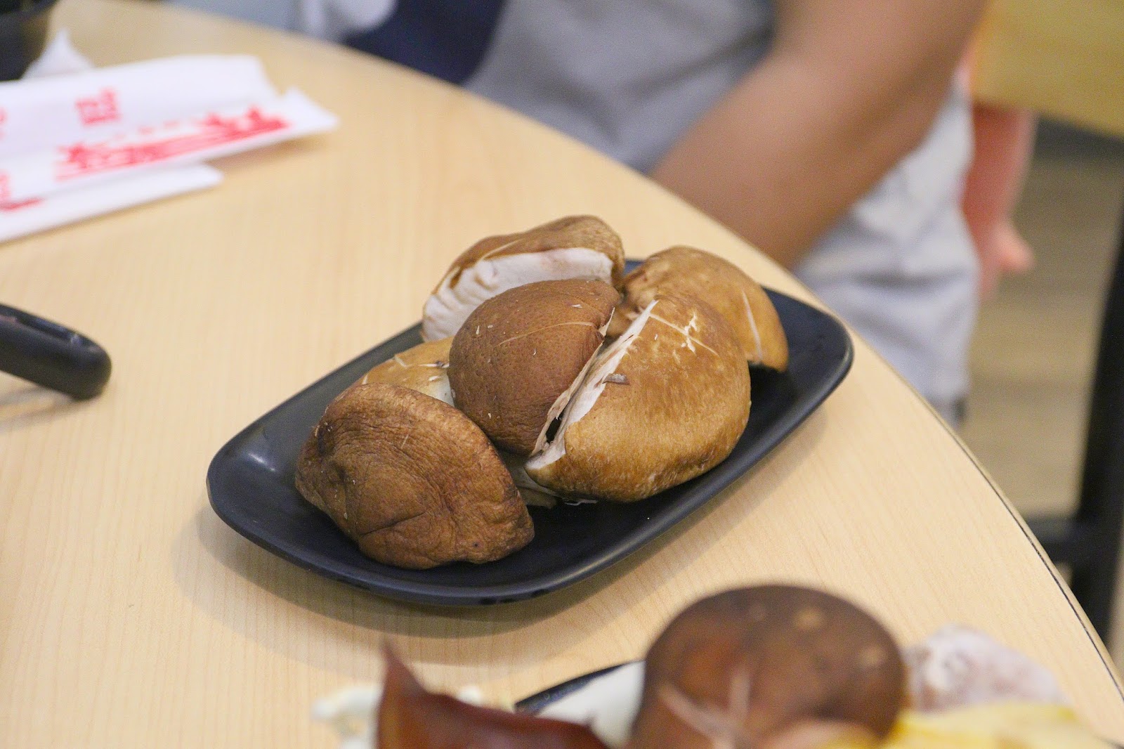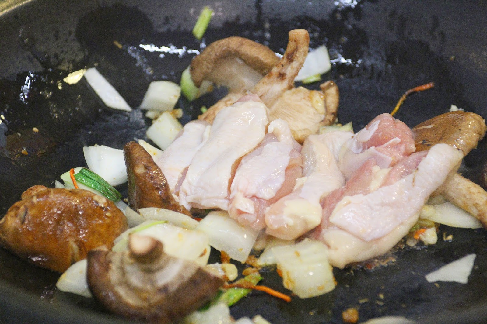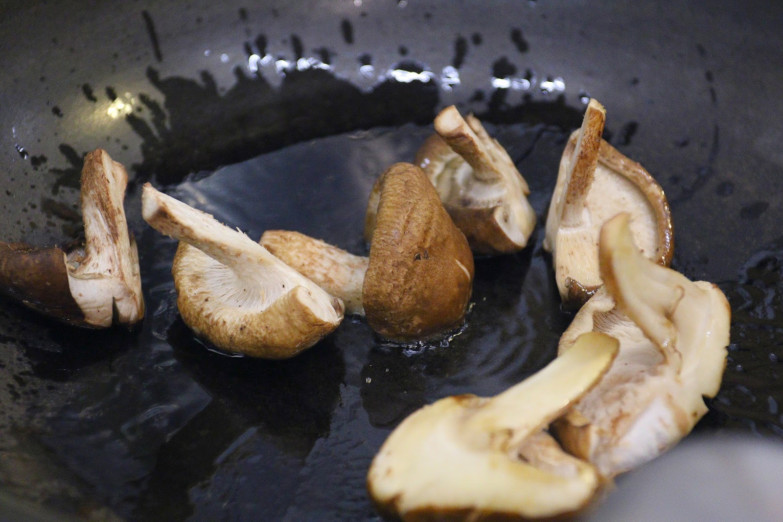 前製爆香會由服務員操作,首先放點油爆香香菇(菜盤裡只有一朵),