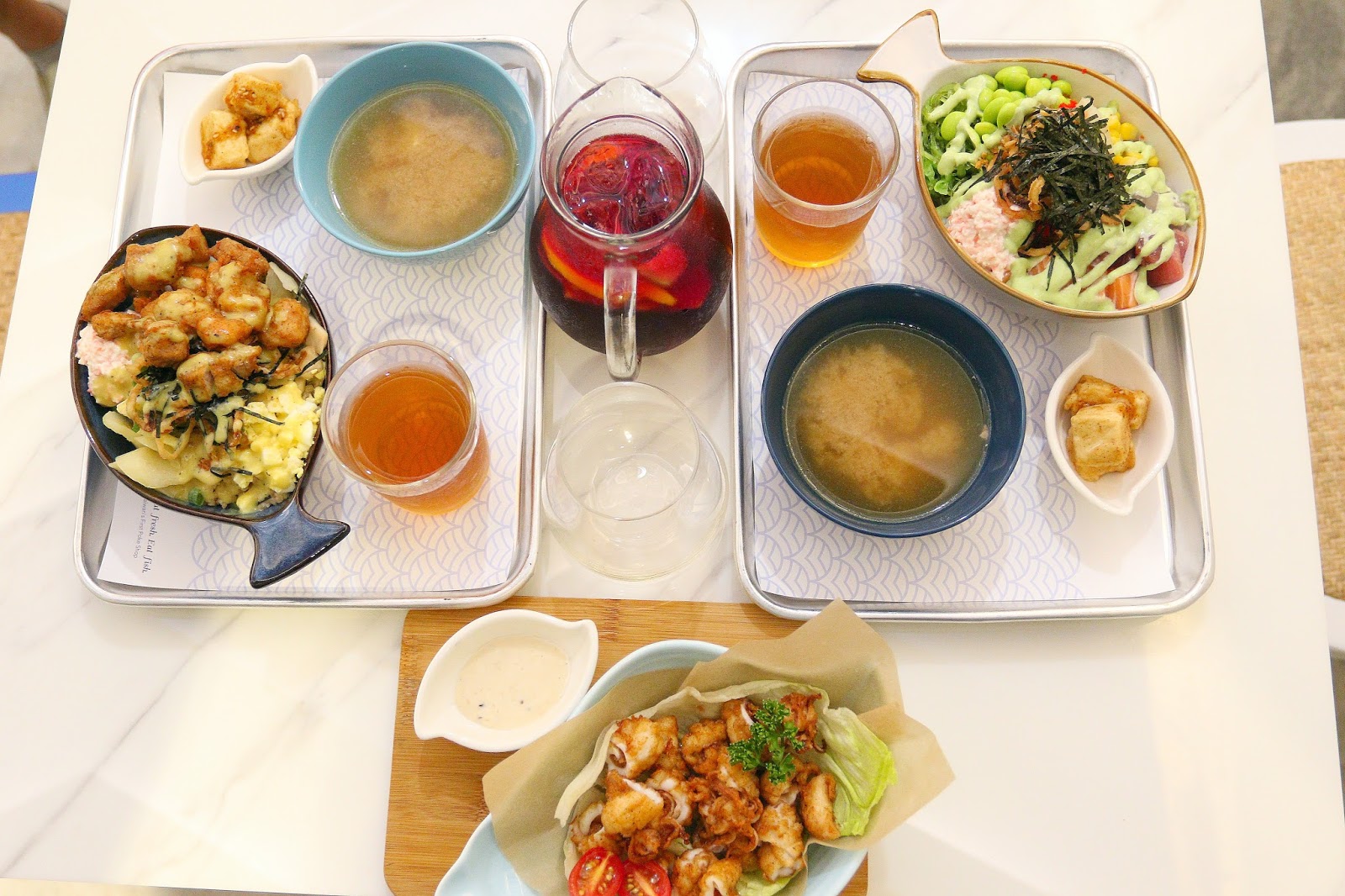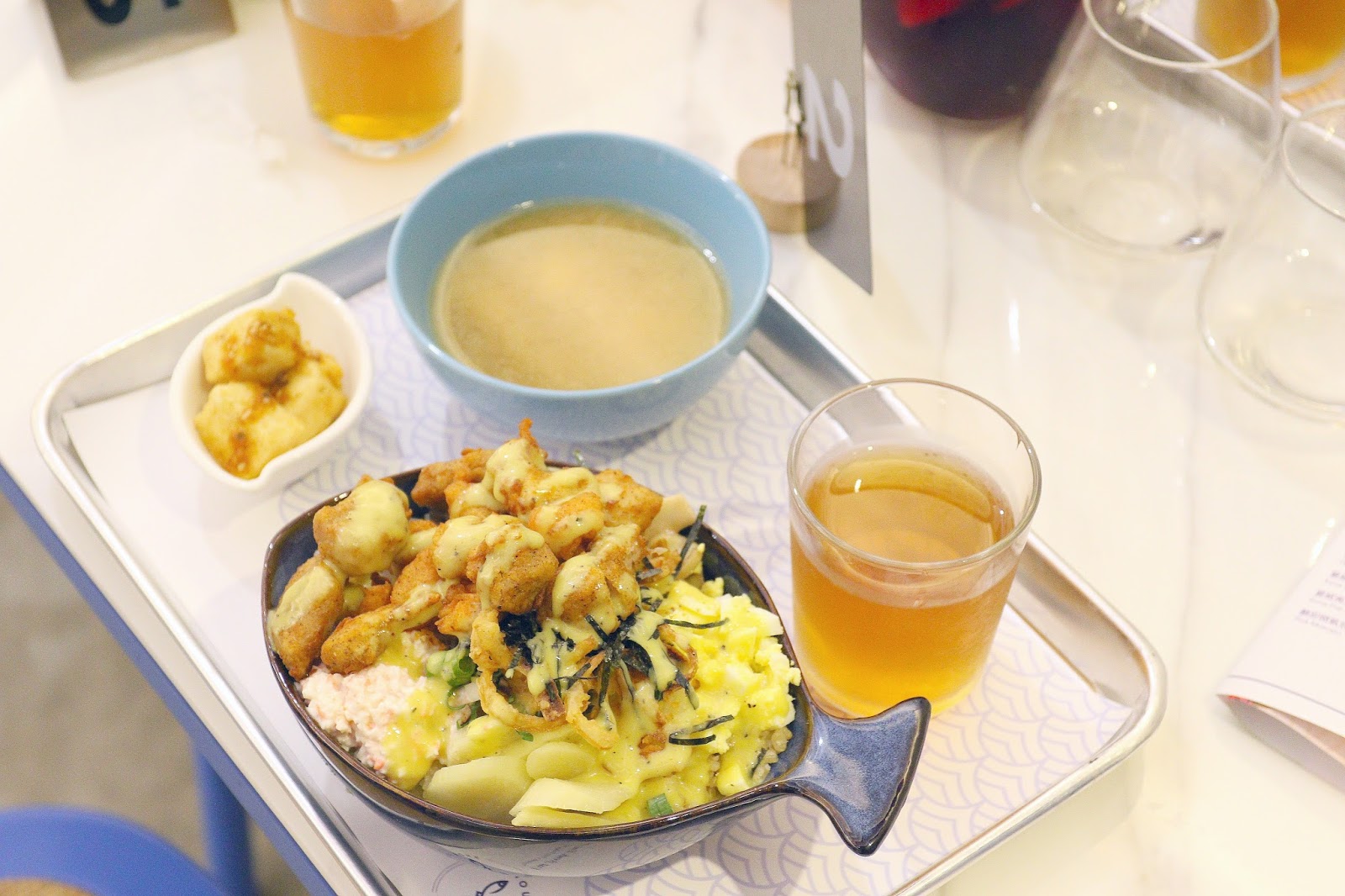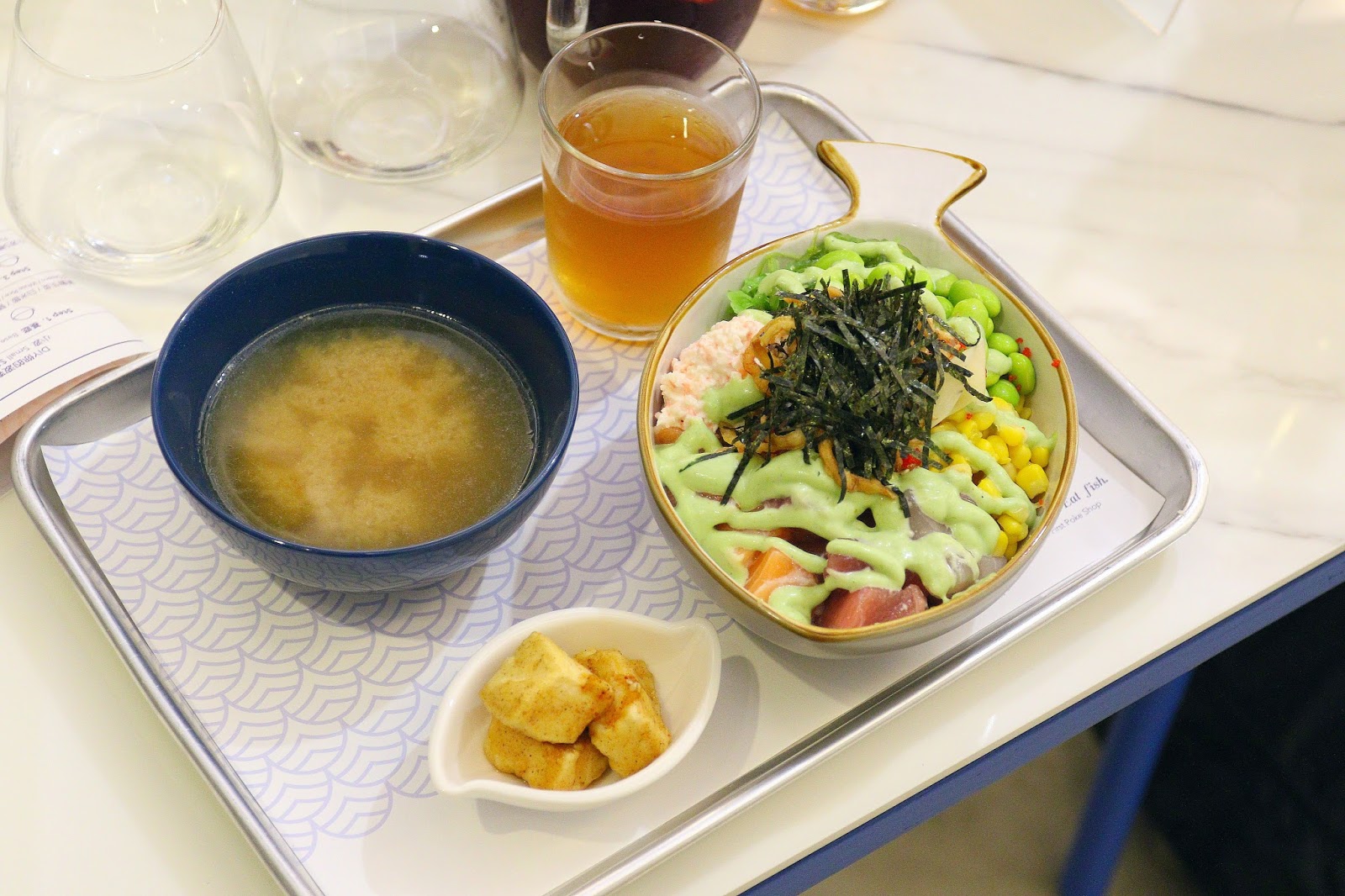 主餐外還有鮭魚味噌湯、炸嫩豆腐、麥茶,魚造型的容器跟Poke很搭,