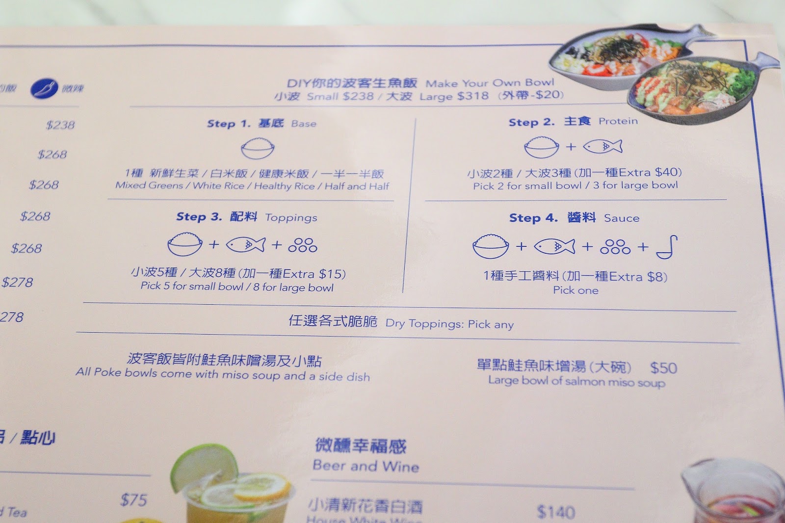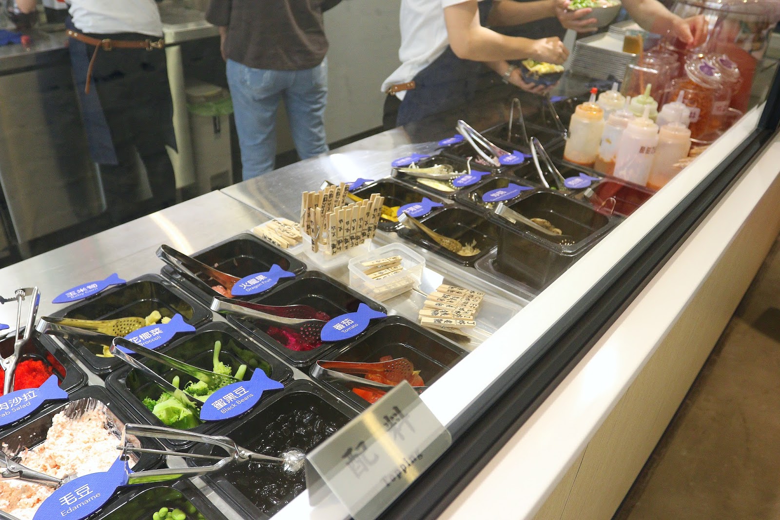 除了已配好的餐點外也可以自己選配,飯的種、配料、醬汁(柚香醬油、黃金柑橘醬、美式醃燻醬、哇沙米美乃滋、川味辣美乃滋、酸甜美乃滋),