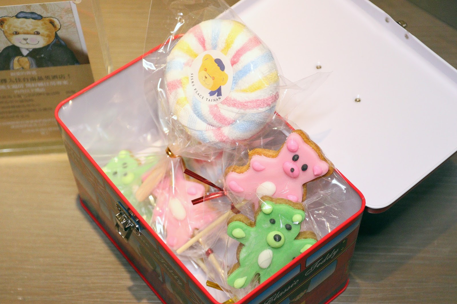 棒棒糖毛巾跟餅乾因為友人先使用了所以有點亂,英國雙層巴士造型的鐵盒也是能帶走的,