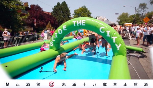 在美國一個名叫[城市滑水道(Slide The City)]的團體,從美國的鹽湖城開始帶著300公尺長的充氣滑水道讓大家在街道上盡情滑水,看似異想天開的計畫但所到之處無不讓大家瘋狂的,