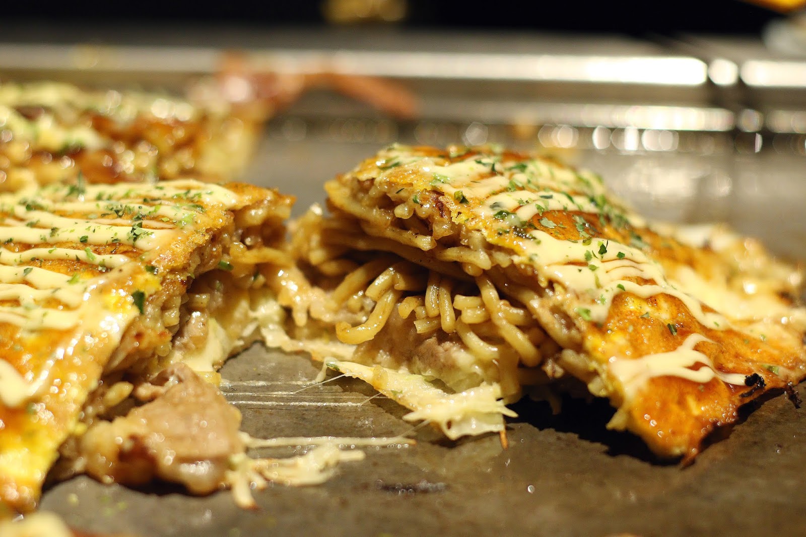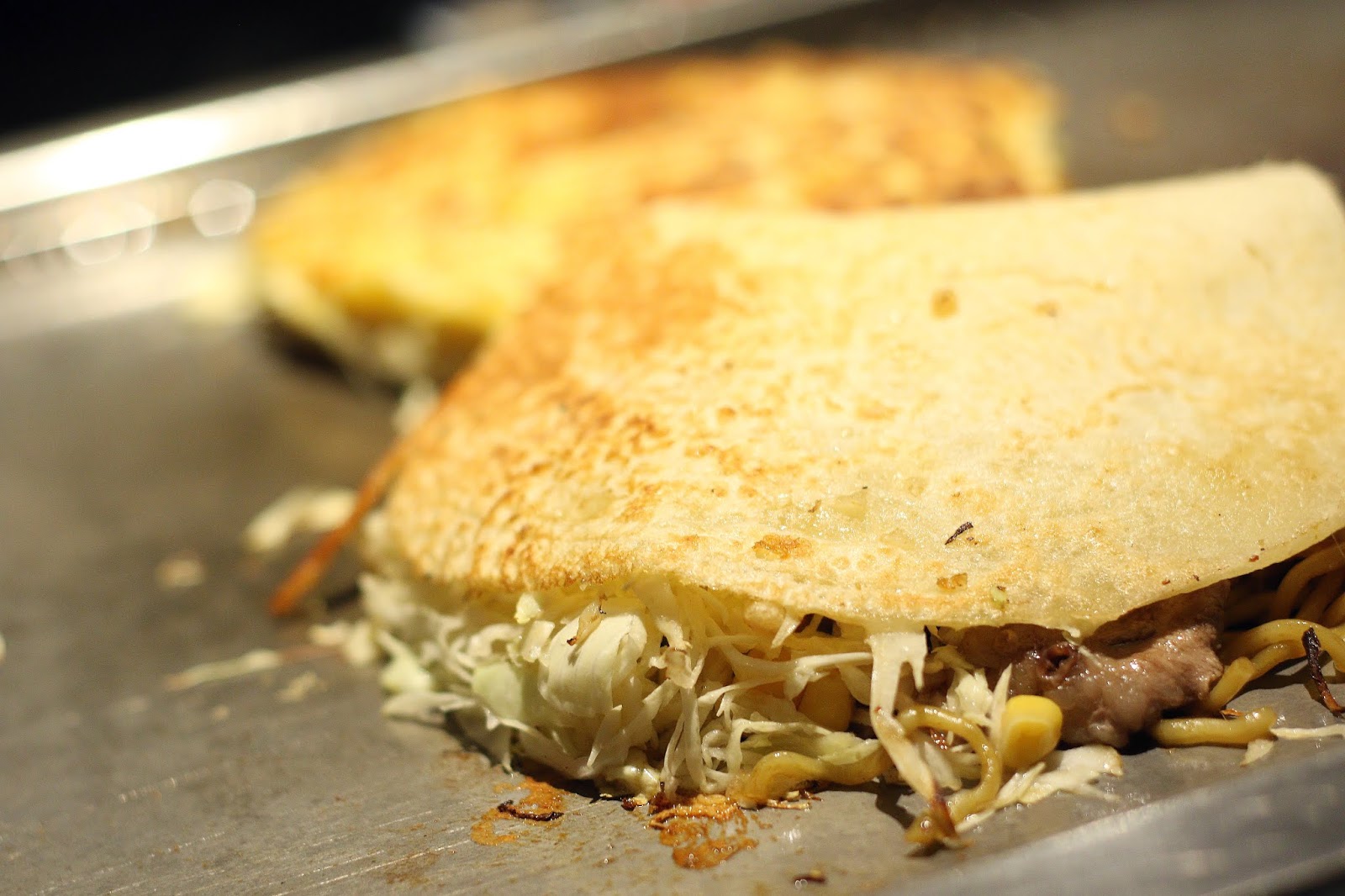 廣島燒則是先煎一片麵皮,再把高麗菜絲、玉米粒、麵酥、煎至焦香的牛五花,把食材堆疊在上,