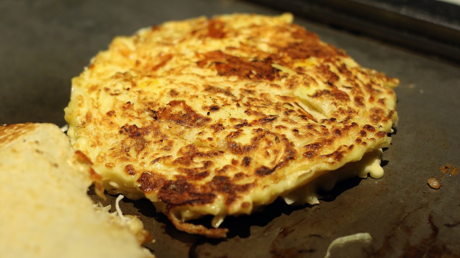 基本煎法跟日本差不多,把食材與麵糊先在碗裡拌勻,食材有高麗菜絲、玉米、麵酥,麵糊放到鐵板上煎熟一面,另一面鋪上煎香豬肉片,